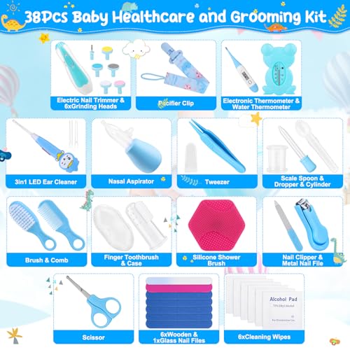 【38 in 1 Child Well being Kits】Child Grooming Equipment contains Electrical Nail Trimmer, 6 x Grinding Heads, Pacifier Clip, Data Card, 3in1 LED Ear Cleaner, Nasal Aspirator, Tweezer, Scale Spoon, Dropper, Cylinder, Brush, Comb, Finger Toothbrush & Case, Silicone Bathe Brush, Grip Nail Clipper, Scissor, 6 x Picket & 1 x Metallic & 1 x Glass Nail Information, 6 x Cleansing Wipes, Storage Bag. Every with nice sensible worth. All merchandise are finely ready for newborns, absolutely meet the infant’s day by day wants!